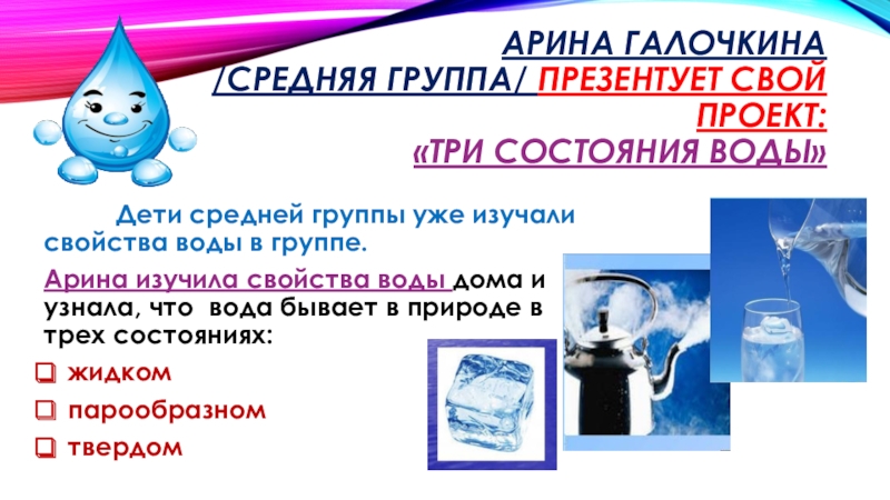 Арина изучила свойства воды дома и узнала, что вода бывает в природе в трех состояниях: