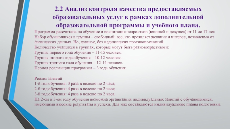 Слайд 92.2 Анализ контроля качества предоставляемых образовательных услуг в рамках дополнительной образовательной