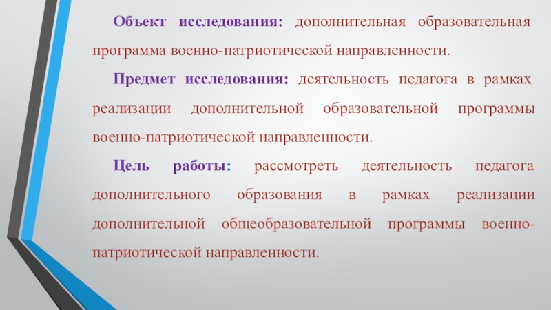Слайд 3Объект исследования: дополнительная образовательная программа военно-патриотической направленности.
