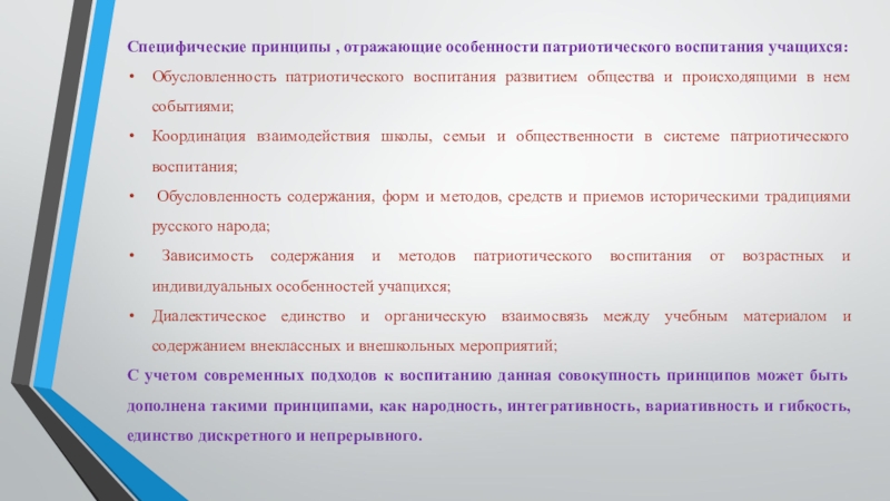 С учетом современных подходов к воспитанию данная совокупность принципов может быть дополнена такими принципами, как народность, интегративность, вариативность и гибкость, единство дискретного и непрерывного.