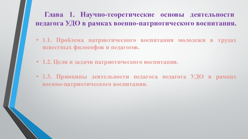 Слайд 5Глава 1. Научно-теоретические основы деятельности педагога УДО в рамках военно-патриотического воспитания.