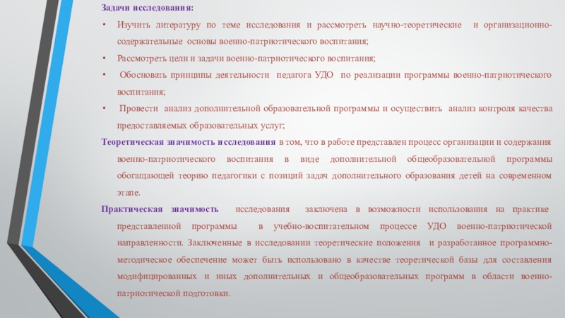 Теоретическая значимость исследования в том, что в работе представлен процесс организации и содержания военно-патриотического воспитания в виде дополнительной общеобразовательной программы обогащающей теорию педагогики с позиций задач дополнительного образования детей на современном этапе.