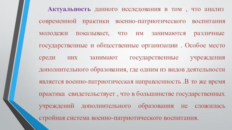 Слайд 2Актуальность данного исследования в том , что анализ современной практики военно-патриотического