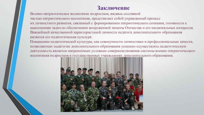 Военно-патриотическое воспитание подростков, являясь составной частью патриотического воспитания, представляет собой управляемый процесс их личностного развития,