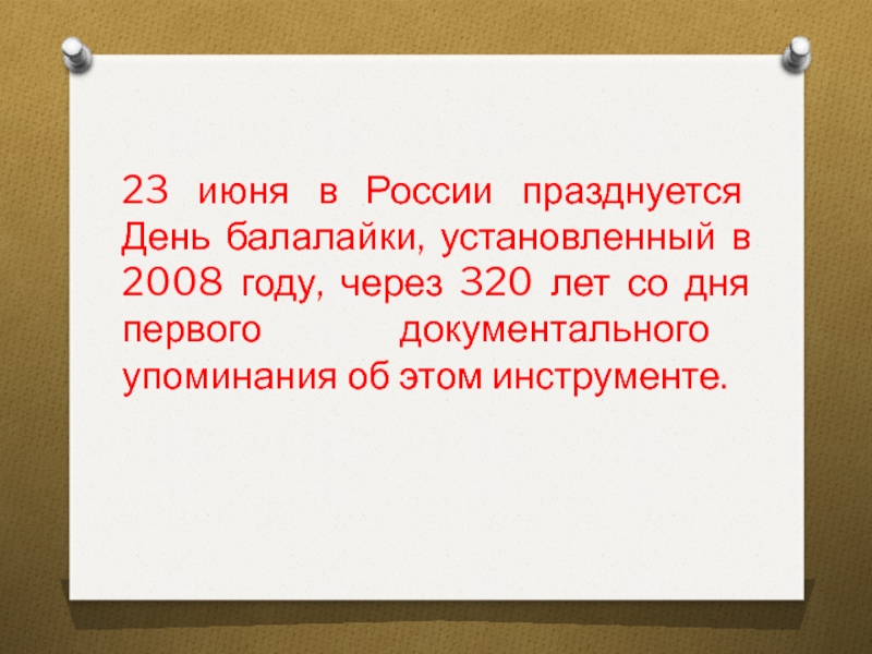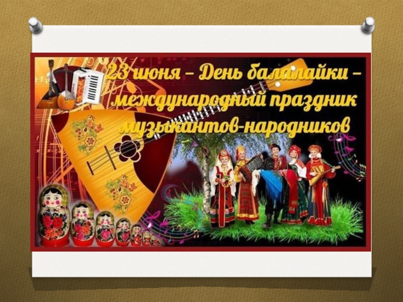 Слайд 2623 июня в России празднуется День балалайки, установленный в 2008 году,