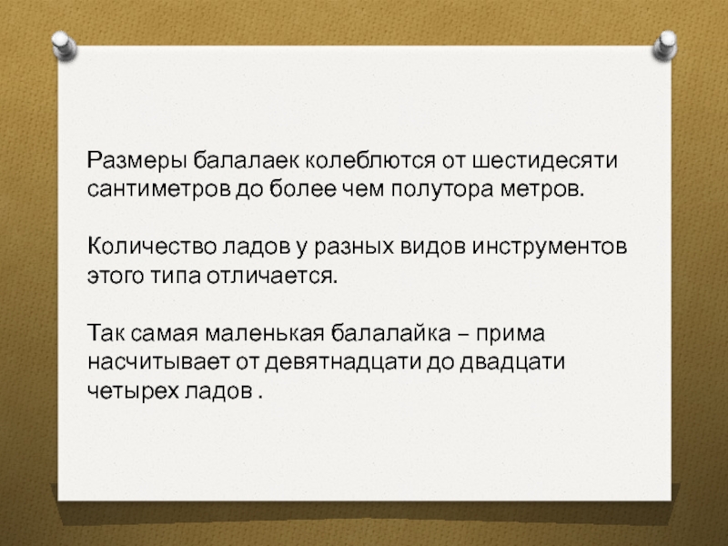Слайд 14Размеры балалаек колеблются от шестидесяти сантиметров до более чем полутора метров.