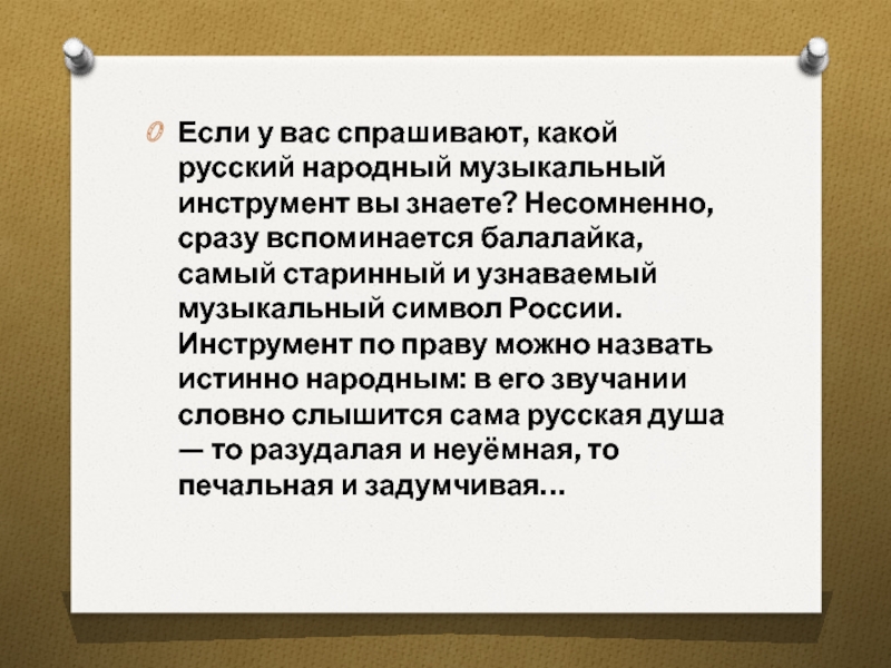 Слайд 3Если у вас спрашивают, какой русский народный музыкальный инструмент вы знаете?