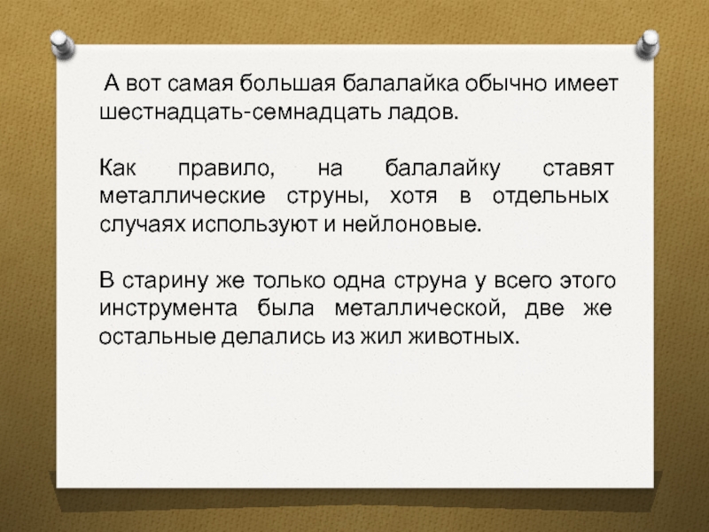 Слайд 16 А вот самая большая балалайка обычно имеет шестнадцать-семнадцать ладов.