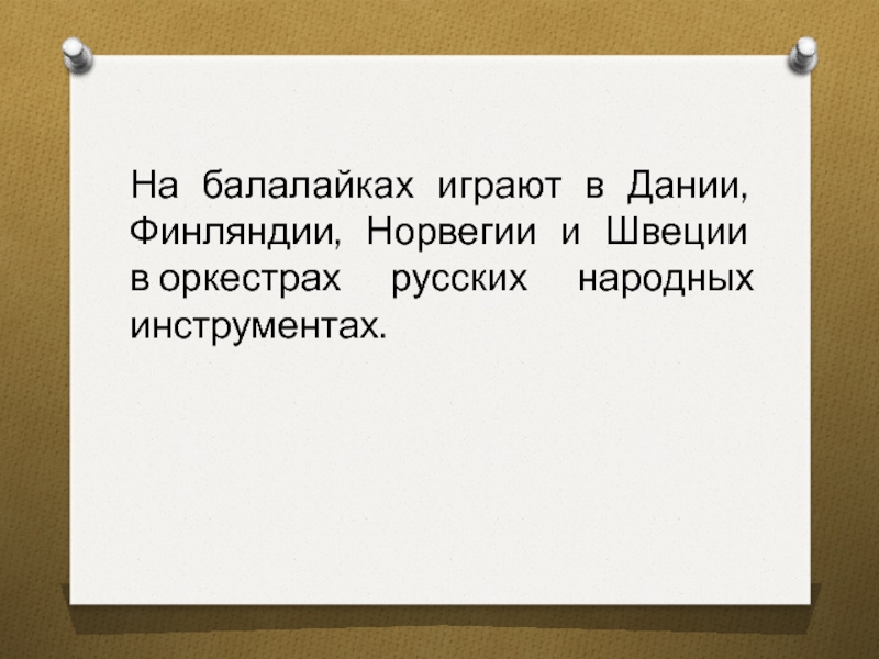 Слайд 30На балалайках играют в Дании, Финляндии, Норвегии и Швеции в оркестрах русских
