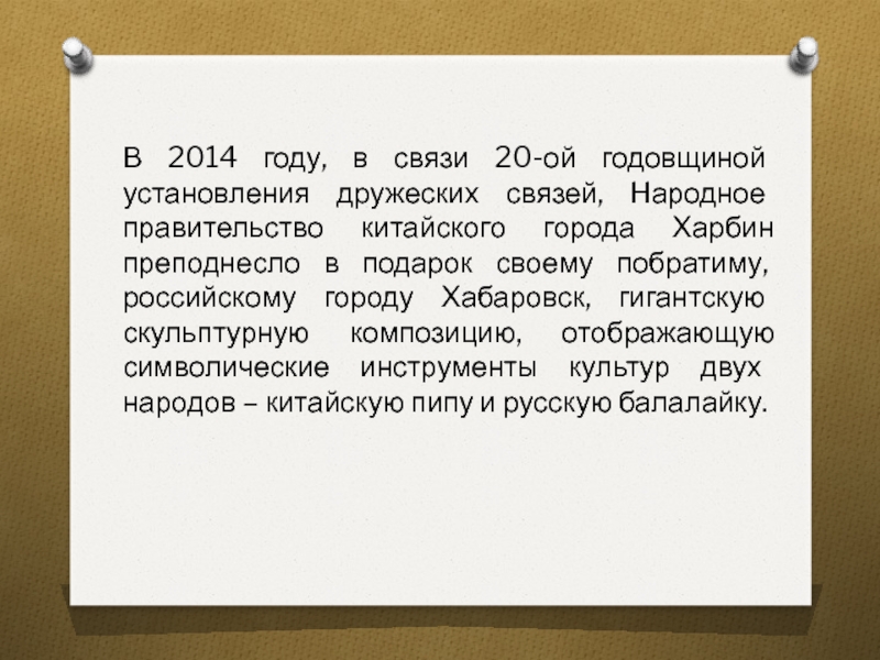 правительство китайского города Харбин преподнесло в подарок своему побратиму, российскому городу Хабаровск, гигантскую скульптурную композицию, отображающую символические инструменты культур двух народов – китайскую пипу и русскую балалайку.