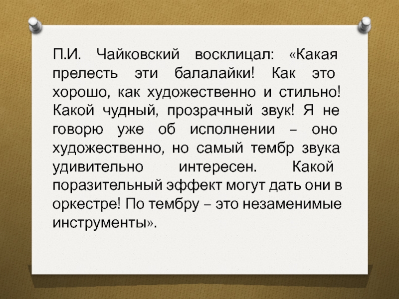 Слайд 5П.И. Чайковский восклицал: «Какая прелесть эти балалайки! Как это хорошо, как