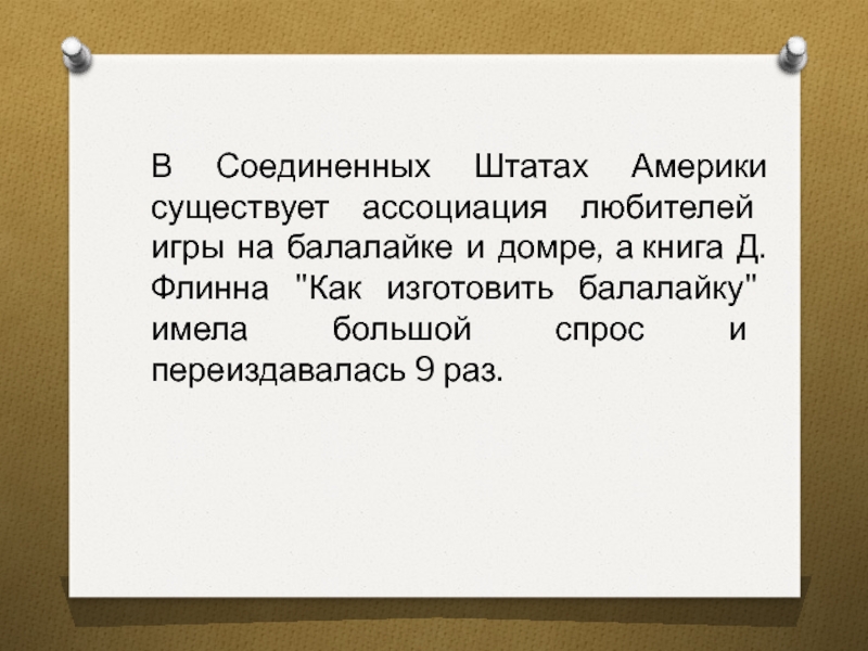 Слайд 24В Соединенных Штатах Америки существует ассоциация любителей игры на балалайке и