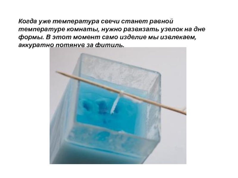 Слайд 9Когда уже температура свечи станет равной температуре комнаты, нужно развязать узелок