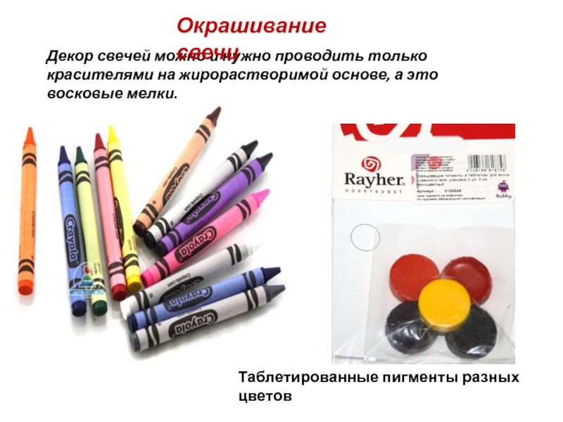Слайд 7Декор свечей можно и нужно проводить только красителями на жирорастворимой основе,