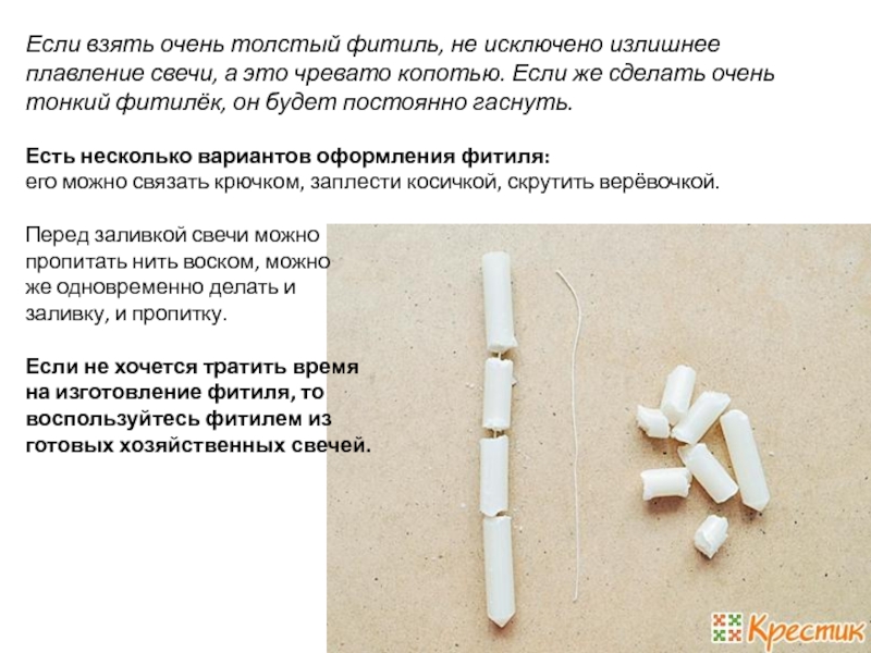 использованием, тогда свеча будет гореть медленнее и ровнее. Длина фитиля должна быть около 6-7 миллиметров. Если она будет больше, то свеча будет сгорать быстрее.