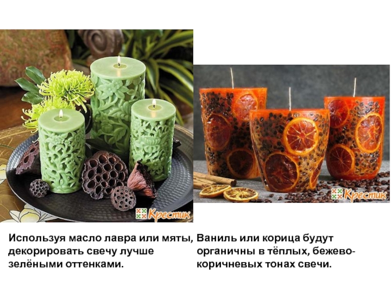 Слайд 11Используя масло лавра или мяты, декорировать свечу лучше зелёными оттенками.