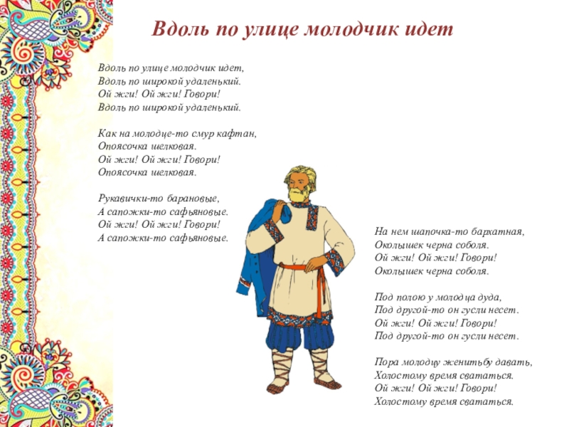 — колядки, масленичные, веснянки, купальские, свадебные, похоронные, игровые, календарные, плясовые, игровые, хороводные, шуточные, солдатские.