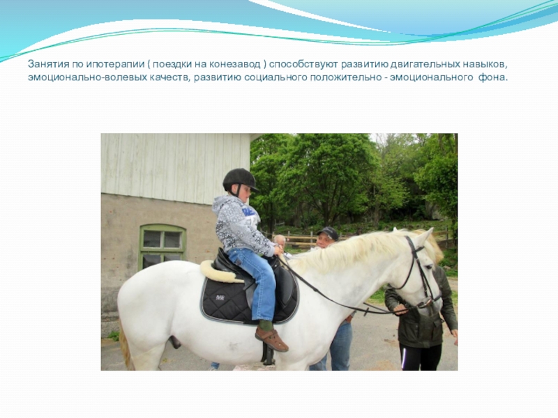 Слайд 8Занятия по ипотерапии ( поездки на конезавод ) способствуют развитию двигательных