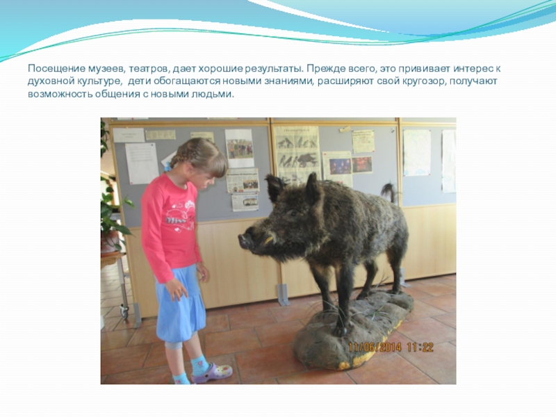 Слайд 16Посещение музеев, театров, дает хорошие результаты. Прежде всего, это прививает интерес