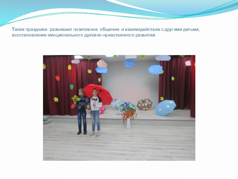 Слайд 13Такие праздники развивают позитивное общение и взаимодействие с другими детьми, восстановление