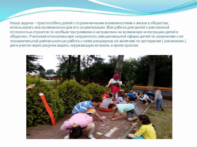 обществе, использовать все возможности для его социализации. Вся работа для детей с умственной отсталостью строится по особым программам и направлена на возможную интеграцию детей в общество. Учитывая относительную сохранность эмоциональной сферы детей по сравнению с их познавательной деятельностью работа с ними расширена на занятиях по арттерапии ( рисованию ), дети учатся через рисунки видеть окружающую их жизнь в ярких красках.