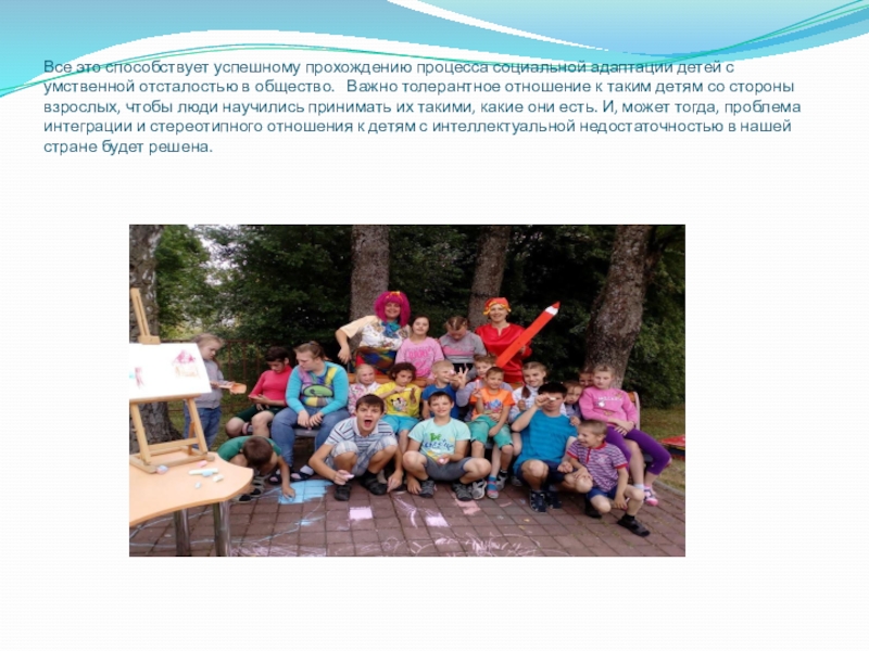 отсталостью в общество. Важно толерантное отношение к таким детям со стороны взрослых, чтобы люди научились принимать их такими, какие они есть. И, может тогда, проблема интеграции и стереотипного отношения к детям с интеллектуальной недостаточностью в нашей стране будет решена.