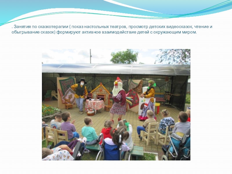 Слайд 7. Занятия по сказкотерапии ( показ настольных театров, просмотр детских видеосказок,