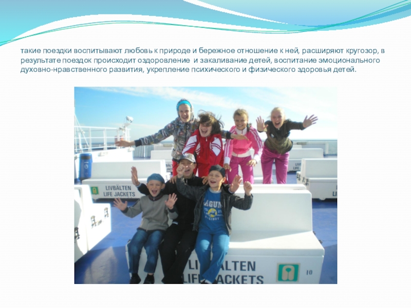 расширяют кругозор, в результате поездок происходит оздоровление и закаливание детей, воспитание эмоционального духовно-нравственного развития, укрепление психического и физического здоровья детей.