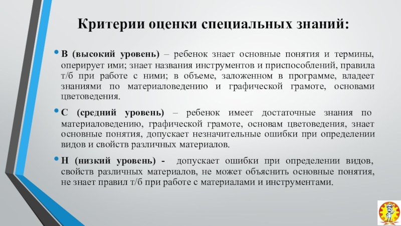Слайд 19Критерии оценки специальных знаний: