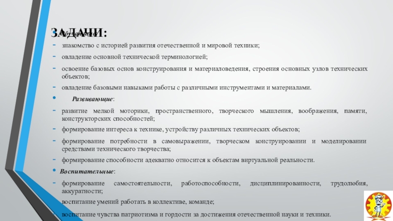 развития способности к самостоятельному решению технических задач, любознательности и инициативы, пространственного и логического мышления, освоения навыков коллективного взаимодействия;