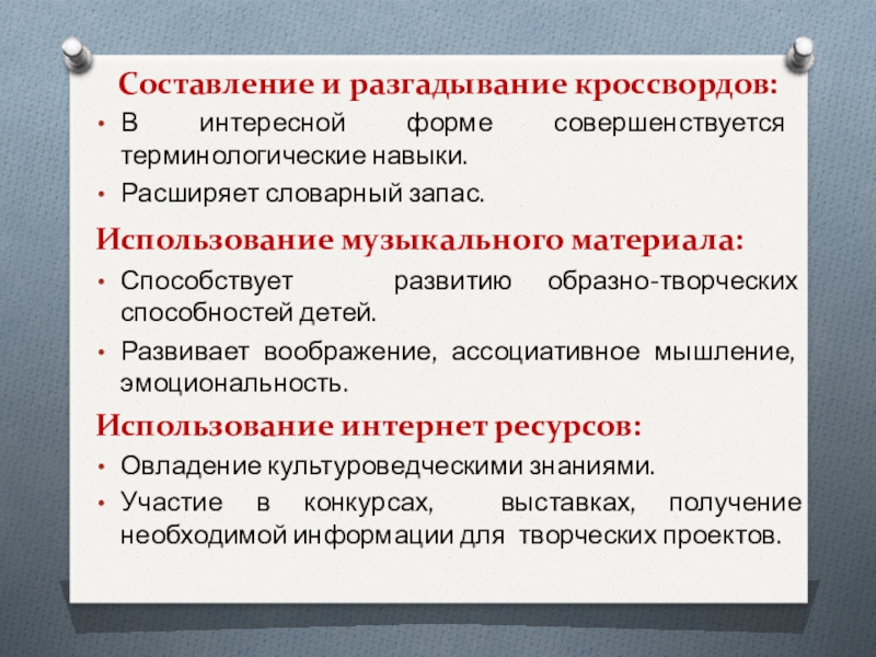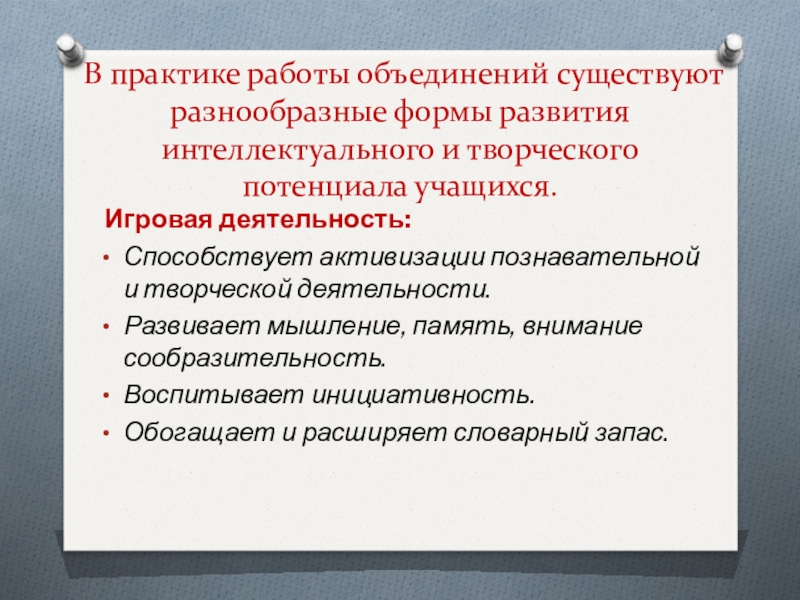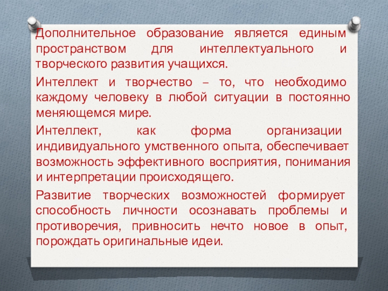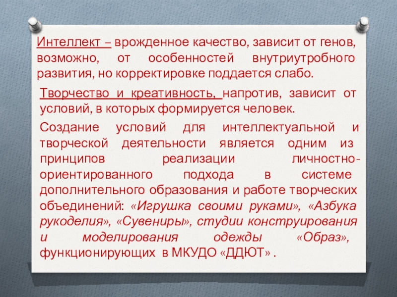 Создание условий для интеллектуальной и творческой деятельности является одним из принципов реализации личностно-ориентированного подхода в системе дополнительного образования и работе творческих объединений: «Игрушка своими руками», «Азбука рукоделия», «Сувениры», студии конструирования и моделирования одежды «Образ», функционирующих в МКУДО «ДДЮТ» .