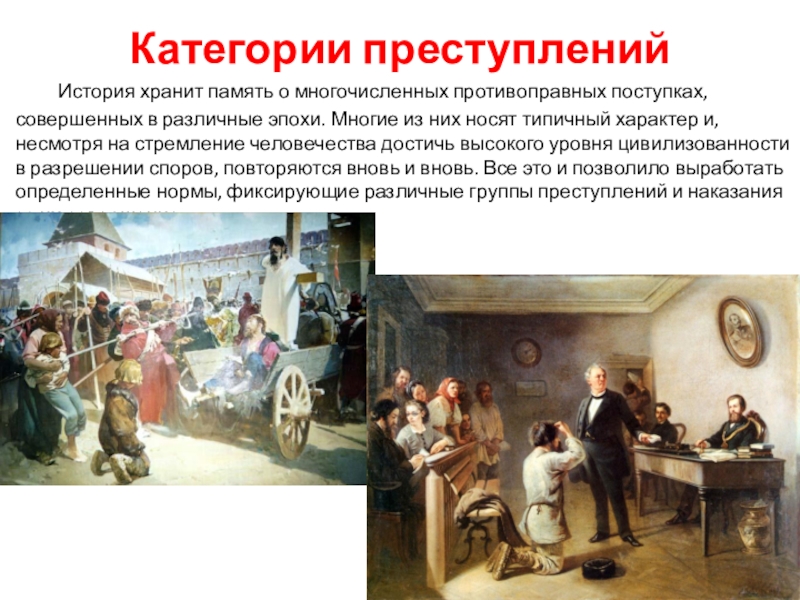 противоправных поступках, совершенных в различные эпохи. Многие из них носят типичный характер и, несмотря на стремление человечества достичь высокого уровня цивилизованности в разрешении споров, повторяются вновь и вновь. Все это и позволило выработать определенные нормы, фиксирующие различные группы преступлений и наказания за их совершение.