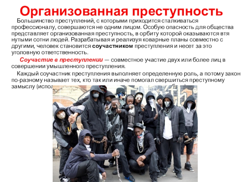 приходится сталкиваться профессионалу, совершаются не одним лицом. Особую опасность для общества представляет организованная преступность, в орбиту которой оказываются втянутыми сотни людей. Разрабатывая и реализуя коварные планы совместно с другими, человек становится соучастником преступления и несет за это уголовную ответственность.