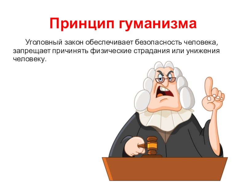 принципов. Так, принцип законности означает, что без приговора суда, основанного на законе, никто не может быть признан виновным в совершении преступления. Человек может нести уголовную ответственность только за преступления.