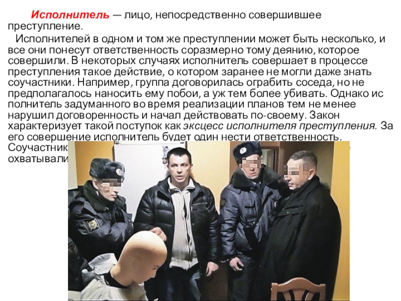 Исполнителей в одном и том же преступлении может быть несколько, и все они понесут ответственность соразмерно тому деянию, которое совершили. В некоторых случаях исполнитель совершает в процессе преступления такое действие, о котором заранее не могли даже знать соучастники. Например, группа договорилась ограбить соседа, но не предполагалось наносить ему побои, а уж тем более убивать. Однако исполнитель задуманного во время реализации планов тем не менее нарушил договоренность и начал действовать по-своему. Закон характеризует такой поступок как эксцесс исполнителя преступления. За его совершение исполнитель будет один нести ответственность. Соучастники отвечают лишь за те действия исполнителя, которые охватывались их умыслом.