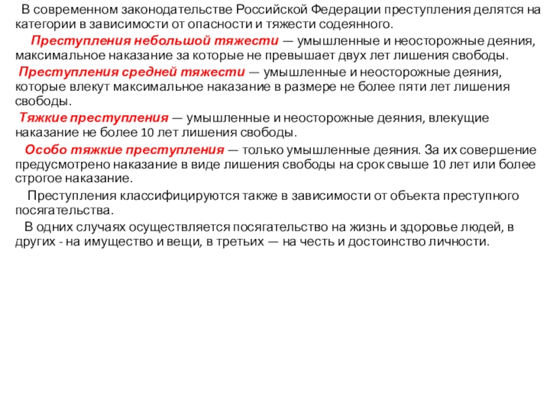 Тяжкие преступления — умышленные и неосторожные деяния, влекущие наказание не более 10 лет лишения свободы.
