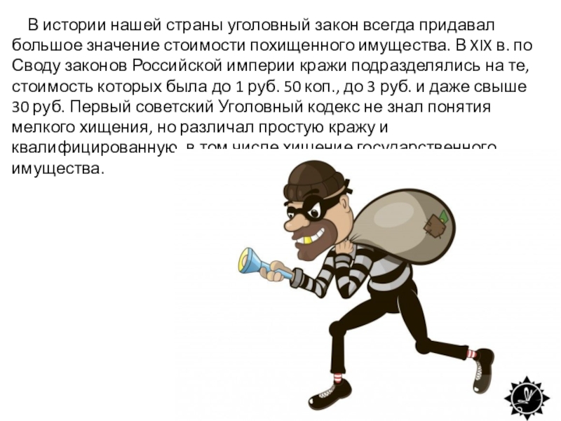 значение стоимости похищенного имущества. В XIX в. по Своду законов Российской империи кражи подразделялись на те, стоимость которых была до 1 руб. 50 коп., до 3 руб. и даже свыше 30 руб. Первый советский Уголовный кодекс не знал понятия мелкого хищения, но различал простую кражу и квалифицированную, в том числе хищение государственного имущества.