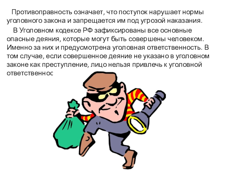 Слайд 18 Противоправность означает, что поступок нарушает нормы уголовного закона и