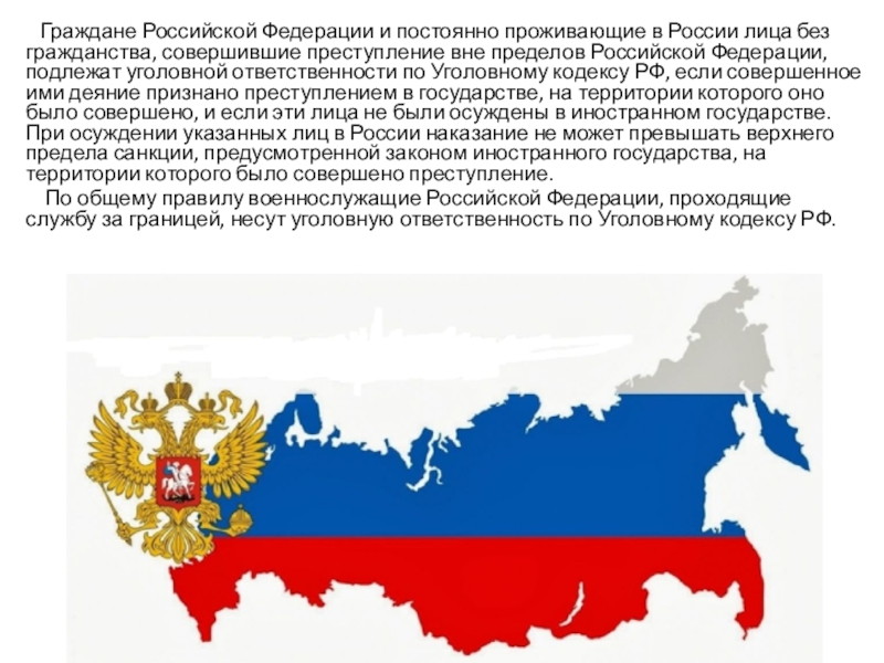 без гражданства, совершившие преступление вне пределов Российской Федерации, подлежат уголовной ответственности по Уголовному кодексу РФ, если совершенное ими деяние признано преступлением в государстве, на территории которого оно было совершено, и если эти лица не были осуждены в иностранном государстве. При осуждении указанных лиц в России наказание не может превышать верхнего предела санкции, предусмотренной законом иностранного государства, на территории которого было совершено преступление.