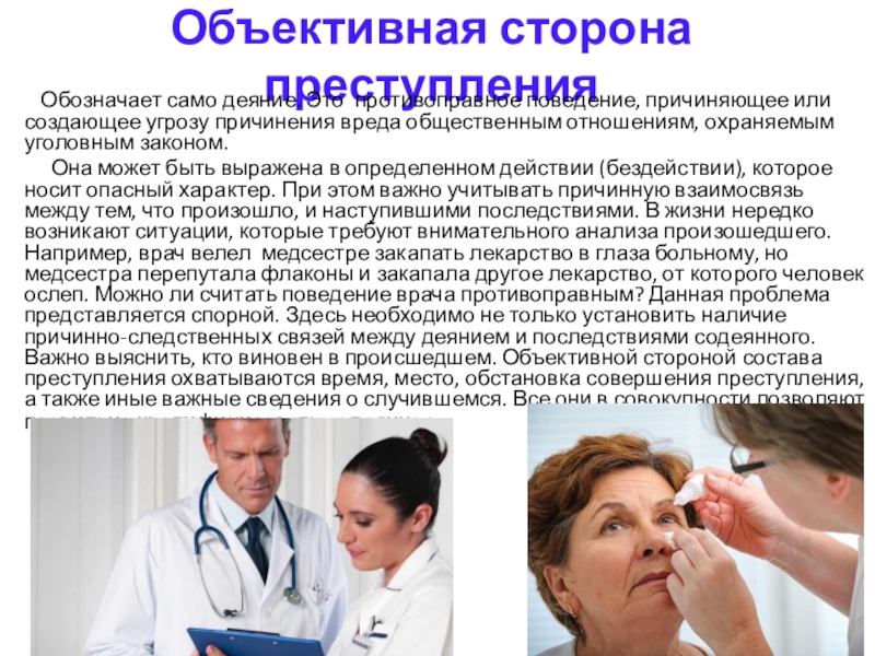 Она может быть выражена в определенном действии (бездействии), которое носит опасный характер. При этом важно учитывать причинную взаимосвязь между тем, что произошло, и наступившими последствиями. В жизни нередко возникают ситуации, которые требуют внимательного анализа произошедшего. Например, врач велел медсестре закапать лекарство в глаза больному, но медсестра перепутала флаконы и закапала другое лекарство, от которого человек ослеп. Можно ли считать поведение врача противоправным? Данная проблема представляется спорной. Здесь необходимо не только установить наличие причинно-следственных связей между деянием и последствиями содеянного. Важно выяснить, кто виновен в происшедшем. Объективной стороной состава преступления охватываются время, место, обстановка совершения преступления, а также иные важные сведения о случившемся. Все они в совокупности позволяют правильно квалифицировать содеянное.