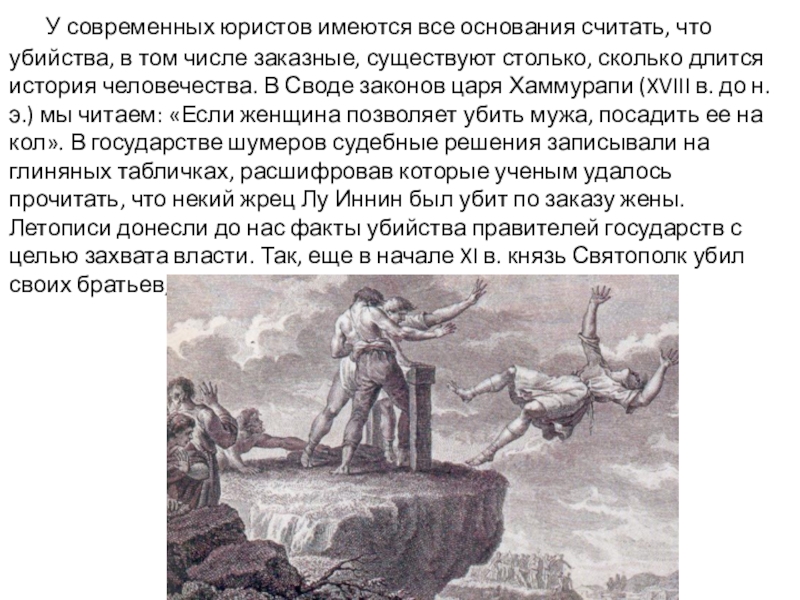 считать, что убийства, в том числе заказные, существуют столько, сколько длится история человечества. В Своде законов царя Хаммурапи (XVIII в. до н.э.) мы читаем: «Если женщина позволяет убить мужа, посадить ее на кол». В государстве шумеров судебные решения записывали на глиняных табличках, расшифровав которые ученым удалось прочитать, что некий жрец Лу Иннин был убит по заказу жены. Летописи донесли до нас факты убийства правителей государств с целью захвата власти. Так, еще в начале XI в. князь Святополк убил своих братьев, чтобы захватить престол в Киеве.