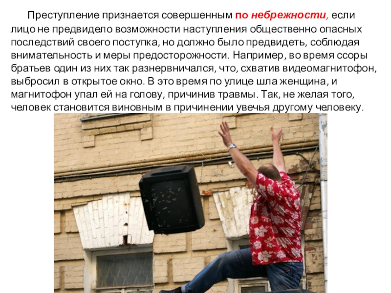 не предвидело возможности наступления общественно опасных последствий своего поступка, но должно было предвидеть, соблюдая внимательность и меры предосторожности. Например, во время ссоры братьев один из них так разнервничался, что, схватив видеомагнитофон, выбросил в открытое окно. В это время по улице шла женщина, и магнитофон упал ей на голову, причинив травмы. Так, не желая того, человек становится виновным в причинении увечья другому человеку.