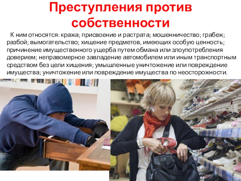 Слайд 43 Рассмотрим некоторые виды преступлений против собственности.