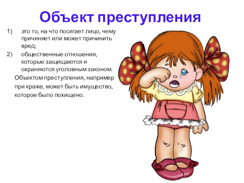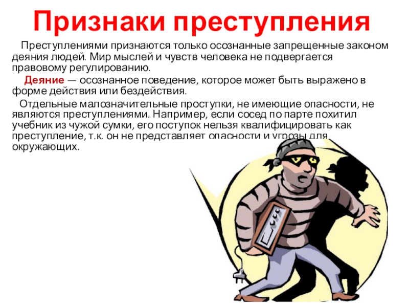 Отдельные малозначительные проступки, не имеющие опасности, не являются преступлениями. Например, если сосед по парте похитил учебник из чужой сумки, его поступок нельзя квалифицировать как преступление, т.к. он не представляет опасности и угрозы для окружающих.