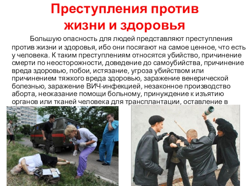опасность для людей представляют преступления против жизни и здоровья, ибо они посягают на самое ценное, что есть у человека. К таким преступлениям относятся убийство, причинение смерти по неосторожности, доведение до самоубийства, причинение вреда здоровью, побои, истязание, угроза убийством или причинением тяжкого вреда здоровью, заражение венерической болезнью, заражение ВИЧ-инфекцией, незаконное производство аборта, неоказание помощи больному, принуждение к изъятию органов или тканей человека для трансплантации, оставление в опасности.