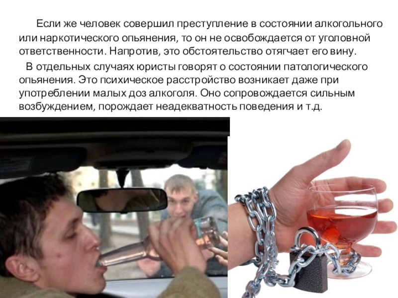 В отдельных случаях юристы говорят о состоянии патологического опьянения. Это психическое расстройство возникает даже при употреблении малых доз алкоголя. Оно сопровождается сильным возбуждением, порождает неадекватность поведения и т.д.