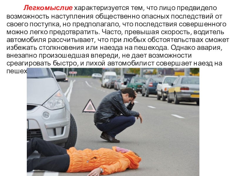 предвидело возможность наступления общественно опасных последствий от своего поступка, но предполагало, что последствия совершенного можно легко предотвратить. Часто, превышая скорость, водитель автомобиля рассчитывает, что при любых обстоятельствах сможет избежать столкновения или наезда на пешехода. Однако авария, внезапно произошедшая впереди, не дает возможности среагировать быстро, и лихой автомобилист совершает наезд на пешехода.