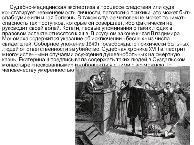 или суда констатирует невменяемость личности, патологию психики: это может быть слабоумие или иная болезнь. В таком случае человек не может понимать опасность тех поступков, которые он совершает, ибо фактически не руководит своей волей. Кстати, первые упоминания о таких людях в правовом аспекте относятся к XII в. В ссудном законе князя Владимира Мономаха содержится указание об исключении «бесных» из числа свидетелей. Соборное уложение 1649 г. освобождало психически больных людей от ответственности за убийство. Судебная хроника XVIII в. пестрит многочисленными случаями осуждения душевнобольных на смертную казнь. Екатерина II предписывала содержать таких людей в Суздальском монастыре «нескованными» и «обращаться с ними с возможною по человечеству умеренностью».