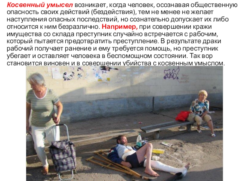 своих действий (бездействия), тем не менее не желает наступления опасных последствий, но сознательно допускает их либо относится к ним безразлично. Например, при совершении кражи имущества со склада преступник случайно встречается с рабочим, который пытается предотвратить преступление. В результате драки рабочий получает ранение и ему требуется помощь, но преступник убегает и оставляет человека в беспомощном состоянии. Так вор становится виновен и в совершении убийства с косвенным умыслом.