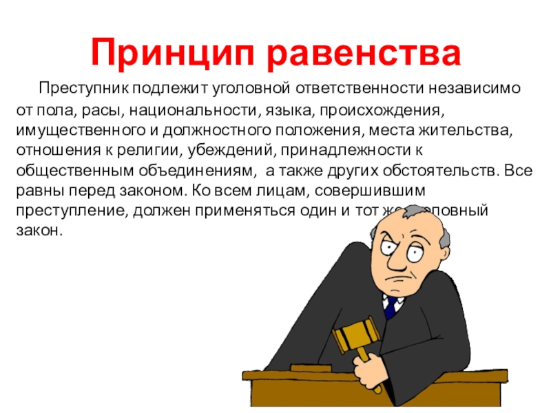 расы, национальности, языка, происхождения, имущественного и должностного положения, места жительства, отношения к религии, убеждений, принадлежности к общественным объединениям, а также других обстоятельств. Все равны перед законом. Ко всем лицам, совершившим преступление, должен применяться один и тот же уголовный закон.